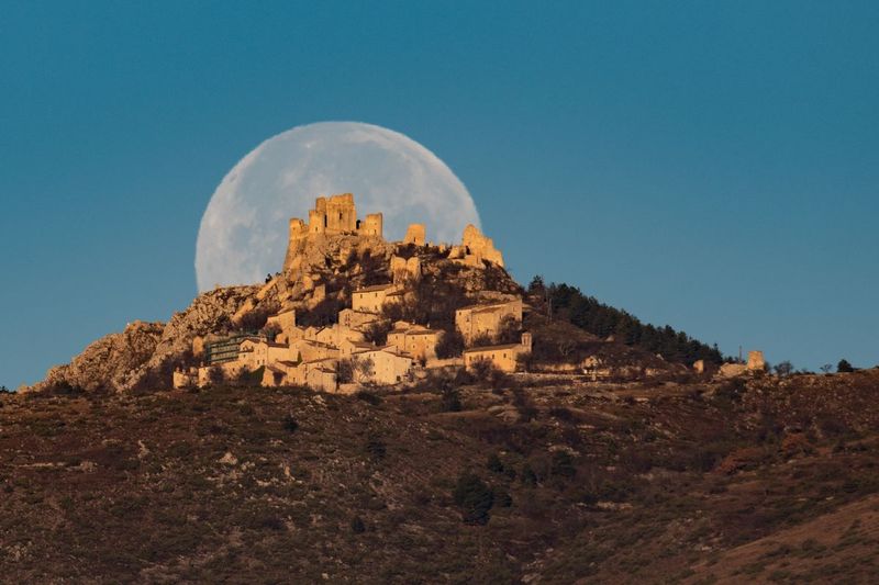 イタリア中部カラーショにある城砦ロッカ・カラーショの背後に昇る「コールドムーン」の満月。2024年12月16日撮影(Lorenzo Di Cola/NurPhoto via Getty Images)
