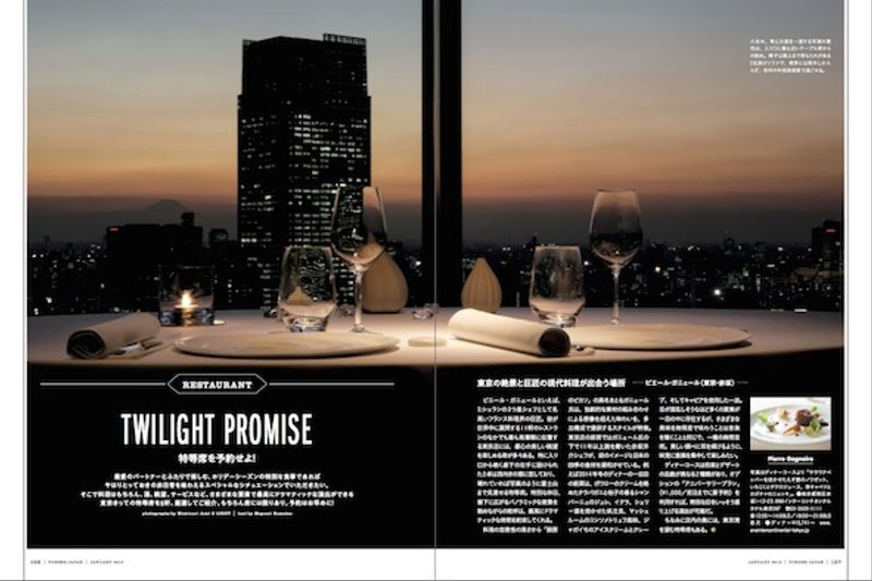 ピエール・ガニェールといえば、ミシュランの3つ星シェフとして名高いフランス料理界の巨匠。彼が世界中に展開する11軒のレストランのなかでも最も高層階に位置する東京店には、都心の美しい眺望を楽しめる席が多々ある。特に入り口から続く廊下の右手に設けられた2卓は西向きの窓に面しており、晴れていれば写真のように富士山まで見渡せる特等席。特別な休日、眼下に広がるパノラミックな夜景を眺めながらの乾杯は、最高にドラマティックな時間を約束してくれる。