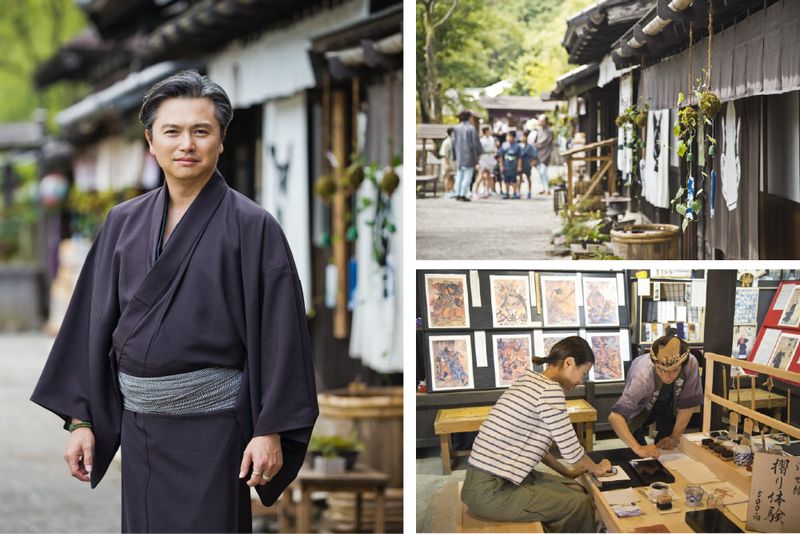 上写真左:ユキリョウイチ◎1972年、東京都生まれ。大学卒業後、世界のさまざまな国を旅して20代を過ごす。その後、稼業の日光江戸村に戻り、カルチャーパーク・EDO WONDERLAND 日光江戸村をつくり上げる。2011年、時代村代表取締役に就任。現在に至る。上写真右上:大人気の江戸職業体験。忍者、新撰組、捕物に扮した子どもたちが江戸の町を巡る。上写真右下:写真は浮世絵摺り体験。ほかにもさまざまな江戸文化のワークショップがある。