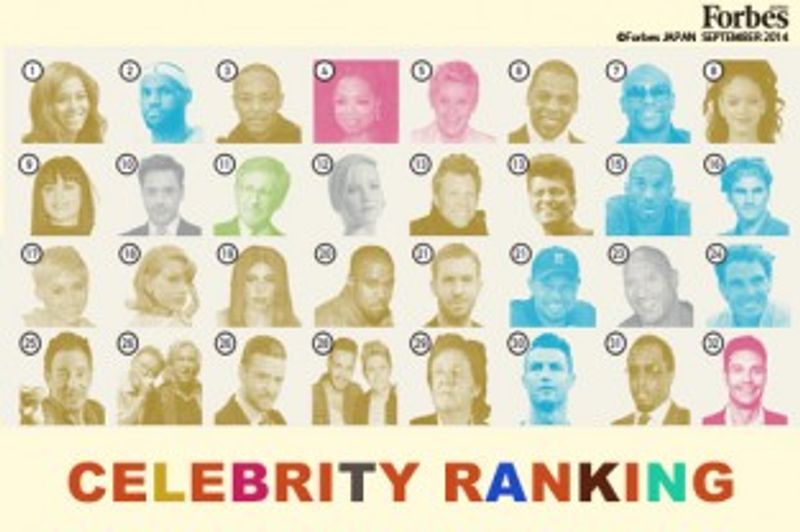 ハリウッド俳優から映画監督、作家、スポーツ選手までを、年間の収入・メディア露出・社会的影響力を基準にフォーブス独自に算出する「セレブリティ100」。今年は初めてミュージシャンのビヨンセが首位に立った。成功裏に終わった「ミセス・カーター・ワールド・ツアー」によるところも大きいが、彼女のブランドを冠した衣類や香水からの収入のほか、約6,300万人もフェイスブックのファンを抱えている社会的影響力もポイントが高かった。躍進著しい俳優のブラッドレー・クーパーが初登場(48位)した一方で、ベテラン勢ではマドンナが上位100人から姿を消している。