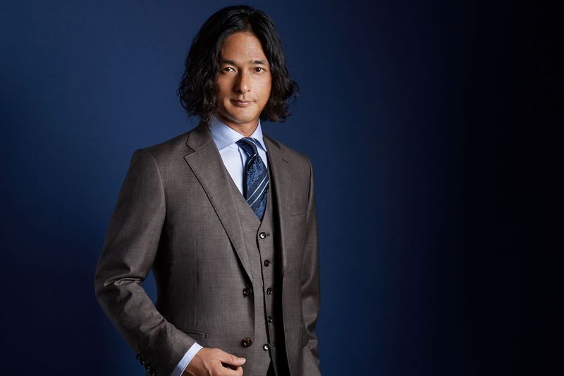 そんな村松が今回選んだスーツはブラウンのスリーピースモデル。生地はイタリアの老舗生地メーカー、ロロ・ピアーナ社を代表するファブリック「タスマニアン」が使われている。この「タスマニアン」は、オーストラリア南東に位置するタスマニア島に由来する生地で、そこに生息するメリノ羊から採れる厳選されたメリノウールで織られている。ブラウンが加えられた独特の生地がこのスーツに品のある艶感を与えている。