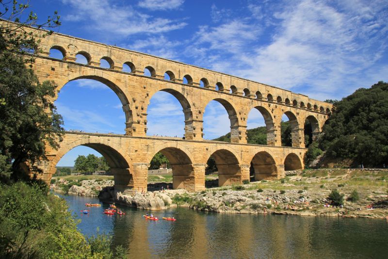 全長275メートル、高さ49メートル、3列のアーチが印象的なこの巨大な橋は、1世紀に古代ローマ人によって建設されました。約2000年も前に、なぜこのような橋が作られたか。それは、当時ネマウススと呼ばれたローマの主要都市(現在のニーム)で人口が増え、水不足を解消するために、水源地であるユゼスから水を引く必要があったからでした。