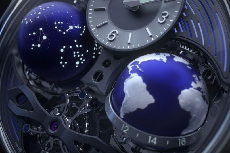 “時”という概念が生まれた宇宙へと思いを馳せる超複雑時計。3時位置の地球儀は24時間で一周するナイト&デイ表示で、第二時間帯表示も兼ね備える。9時位置にある12星座が描かれた天球儀は、23時間58分4秒で一周。そして6時位置にはトゥールビヨン機構を収めている。シンメトリーの美しさを強調するためにリュウズは存在せず、ケースバックに調整用の調整ねじが設けられる。宇宙の神秘を優れた時計技術で表現した、ロマンティックな時計である。手巻き、Tiケース、ケース径47㎜。3802万円(予価、11月発売予定)