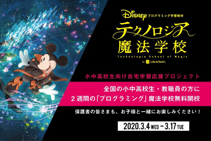「テクノロジア魔法学校」は『プログラミングは現代の魔法である』をテーマとして、魔法学校を舞台にしたオリジナルメインストーリーと、『リロ・アンド・スティッチ』『塔の上のラプンツェル』など8つのディズニー作品をテーマとしたレッスンを収録。ロールプレイングゲームのように冒険の物語が進みながら、Webデザイン・ゲーム制作・メディアアートの3つのコースでプログラミングを基礎から学ぶことのできるオンライン教材だ。