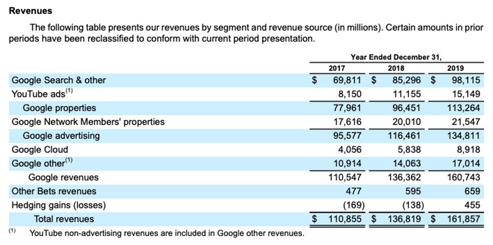 1. 得意収益軸:年次報告書の「Revenue」パートを見ると、グーグル広告が収益の8割強を占めていることがわかります。ユーチューブ広告もそこそこの収益シェアを占めています。ただ、広告が主軸であることから、YouTube Premiereのようなサブスク事業が大きく立ち上がっている見通しが未だありません。