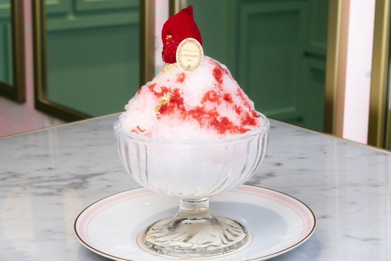 まず、「かき氷 イスパハン」。イスパハンとはラデュレを代表するマカロンケーキで、ローズ、フランボワーズ、ライチの組み合わせが絶妙なアイコニックなケーキだ。ケーキのイスパハンはローズ風味のクリームのなかにライチを忍ばせており、とはいえライチはあくまでもアクセントのポジションであり、主役はローズとフランボワーズだ。