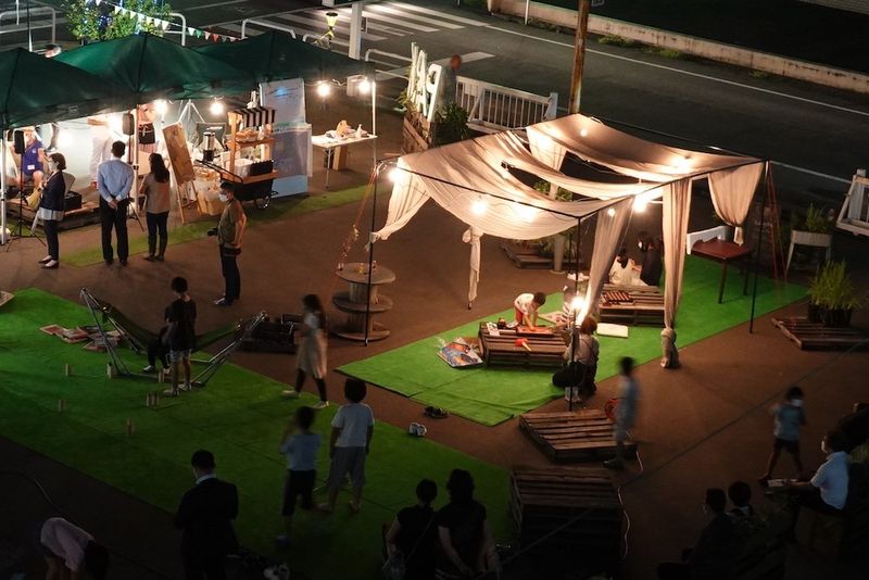 運営側として参加しているのは、地元のまちづくり系団体や大学生ら。皆で力を合わせてタープを張り、人工芝を敷きつめ、会場に装飾を施していく。その場のアイデアで当初の設計とは違うレイアウトにしてみたり、タープの張り方を工夫してみたりと、体を動かしながらのクリエイティブな作業が心地いい。