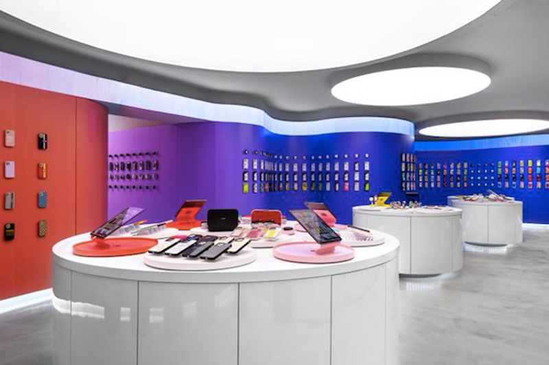 クロスビースタジオのデザインチームは、CASETiFYのトレードマークともいえる色をモチーフとして店内をいくつかの区画に分け、それぞれがグラデーションを描いて次の区画につながるように設計した。居心地のいいコミュニティスペースを再現して、訪れた人にクリエイティブでカスタマイズされた体験を提供し、実用だけでなく、心にもバッテリーチャージできる場所を設けた。