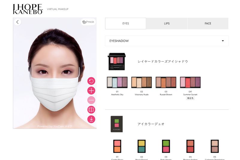 パーフェクト社のバーチャルメイクとバーチャルマスクを組み合わせた体験型コンテンツの提供は国内初の事例となり、「KANEBO」の公式ウェブサイト上では、夏の夕暮れや地層、大地など、自然の移ろいからインスパイアされた新アイシャドウ「レイヤードカラーズアイシャドウ」をはじめとするKANEBO 2021年夏ポイントメイクアイテムを、マスクと組み合わせて同時に体験することが可能だ。