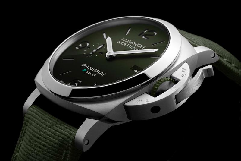 ケース素材などにeスティールを使用する「ルミノール マリーナ eスティール™」。グラデーションダイヤルも特徴で、バリエーションはブループロフォンド、グリジオロッチャ、ヴェルデスメラルドの3種。ダイヤルと同系色のテキスタイルストラップもリサイクル素材を使用。各¥1,056,000(10月発売予定)