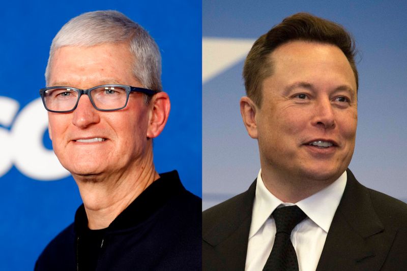 左から、アップルCEO ティム・クック、テスラCEO イーロン・マスク(photo by Getty Images)