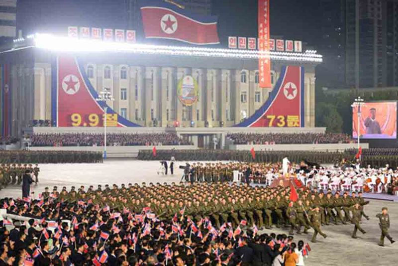 パレード参加者らは、膝を曲げない「グースステップ(ガチョウ歩き)」というスタイルの行進を行った。ナチスドイツや旧共産主義諸国の軍隊が取り入れた行進だ。9日の行進をみると、正規軍のパレードで見せる、足を90度に上げて弾むように行進する姿こそなかったが、きちんと統制の取れた行進だった。北朝鮮を長く分析した自衛隊の元幹部は「行進で一番難しいのが、横の列のそろえ方。わずかな歩幅や速度の違いでも乱れが出る。9日の行進を上空から撮影した映像をみると、中隊ごとに、きちんとした箱形になって行進していた。腕の振り上げ方もきちんと一致していた」と語る。