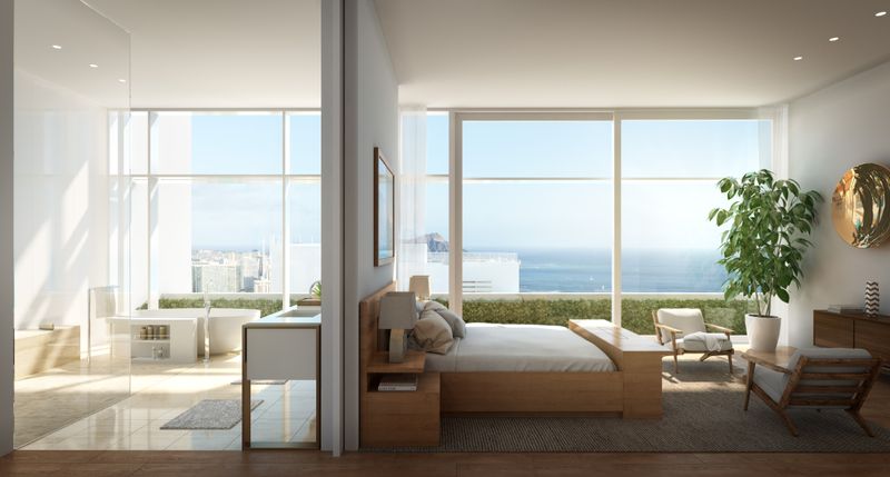 ゲートウェイタワーズは、円形型の「シリンダー」と刃物のようなシェイプの「ブレード」の2つの棟からなる。シリンダーは円形建造物にありがちなデッドスペースをもたない完璧な空間構成で、入り口ドアの位置を熟慮したレイアウトにより、カーブを描く窓を通してパノラミックな景観が得られるようになっているのが特徴だ。デザインコンセプトは、日中の自然光と建物自体がつくる日陰、貿易風によって流れる雲が織りなす影の移ろいを生かすこと。それを最大限に生かすべく、床から天井までの高さをもつ大開口部には、紫外線や外気の熱を遮断し涼しく快適な空間をつくる最先端の技術を用いたガラスが用いられている。「最初に彼のプランを見て、海景のフレームのとらえ方やハワイの美しい光の取り入れ方が本当に素晴らしいと感じた」とヴァンダーブームは語ったが、ミュージアムなどの公共施設だけでなく、数多くのレジデンスタワーも手がけ、居住者の要求を明確に把握しているマイヤーならではの哲学が随所に見てとれる。建築作品としてもハイクラスであることが、このコンドニアムの価値をさらに高めることは間違いないだろう。