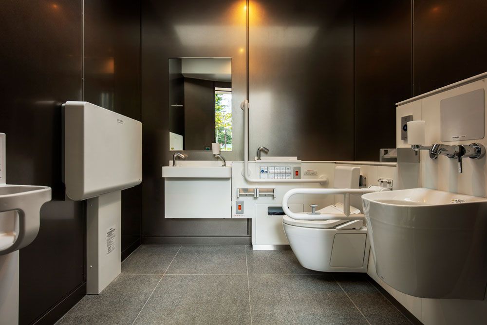 「THE TOKYO TOILET」のコンセプトはあくまでも「誰もが快適に使用できる」だ。そのため、どの公共トイレにもユニバーサルデザインのトイレが設置されている。必ず車椅子対応やオストメイト用設備も完備されている。他にも、ベビーチェアや介護用ベッドなどが設置されているトイレもあり、公式サイトからもそれらの有無が確認できるようになっている。