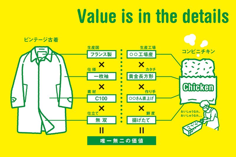 みなさん、「古着」着ていますか? ここでいう古着とは、リサイクルショップ等で売られている中古衣料ではなく、いわゆる「ビンテージ古着」。その定義は諸説ありますが、ここではざっくり、「生まれてから数十年経過している服」とします。さて、いきなり妙な話を始めてしまいましたが、安心してください。今日のテーマは、決して古着漫談ではなく、「付加価値のつくり方」の話。