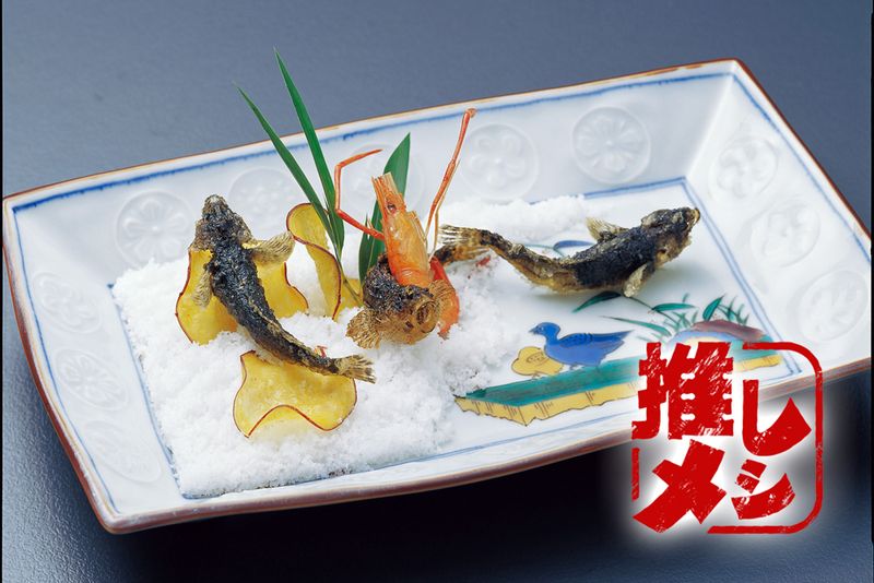 ごりは、石川県でよく食べられる淡水魚で、佃煮や照り焼きにする事もあるが、加賀料理を提供する「大志満」では、川の中で跳ね回っているような美しいフォルムでカラッと揚げて提供される。