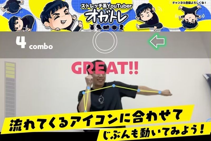 音楽に合わせてストレッチを行う『オガトレHIT』は、『太鼓の達人』をバチではなく体全体でプレイするようなものだと尾形氏は表現しています。ストレッチの動画配信を続けるなかで、自分の体の動きを確認できないために「正確な運動を行えない」、楽しくないので「習慣化しづらい」という動画の弱点に気づいたのが開発のきっかけになったそうです。