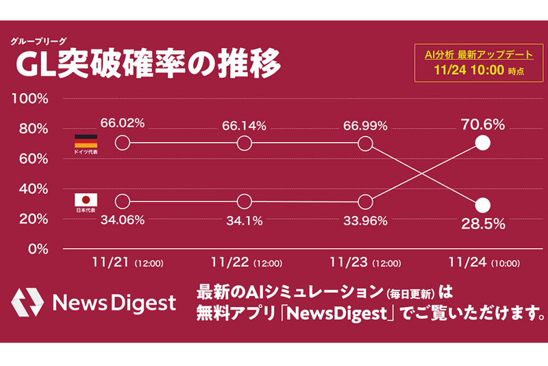 ワールドカップ開催前にこのシミュレーターが予測した優勝確率は、ブラジルが12.2パーセントでトップ。以下、アルゼンチン(10.9パーセント)、フランス(9.6パーセント)、イングランド(7.7パーセント)、オランダ(7.6パーセント)と続いていました。それが、サウジアラビアと日本の勝利によって大きく変動したのです。