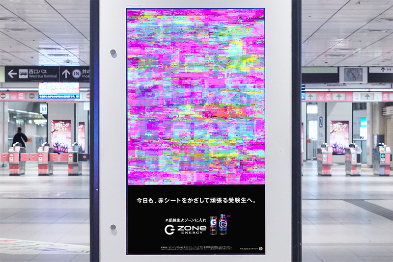 エナジードリンクブランドの「ZONe ENERGY」は、12月5日より渋谷駅と池袋駅の広告スペースに、画像のような一見何が描かれているかわからない画像が掲示されます。この画像、暗記で活用する「赤シート」越しに見ることで、受験生を応援するメッセージが浮かび上がるしくみになっています。