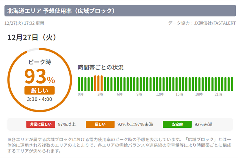 執筆時点(27日18時)では東京と東北は使用率が80%台のためまだ余裕がありますが、北海道は92%以上の厳しい状況。少しでもこういうサイトを目にして節電意識が高まることを期待したいところです。