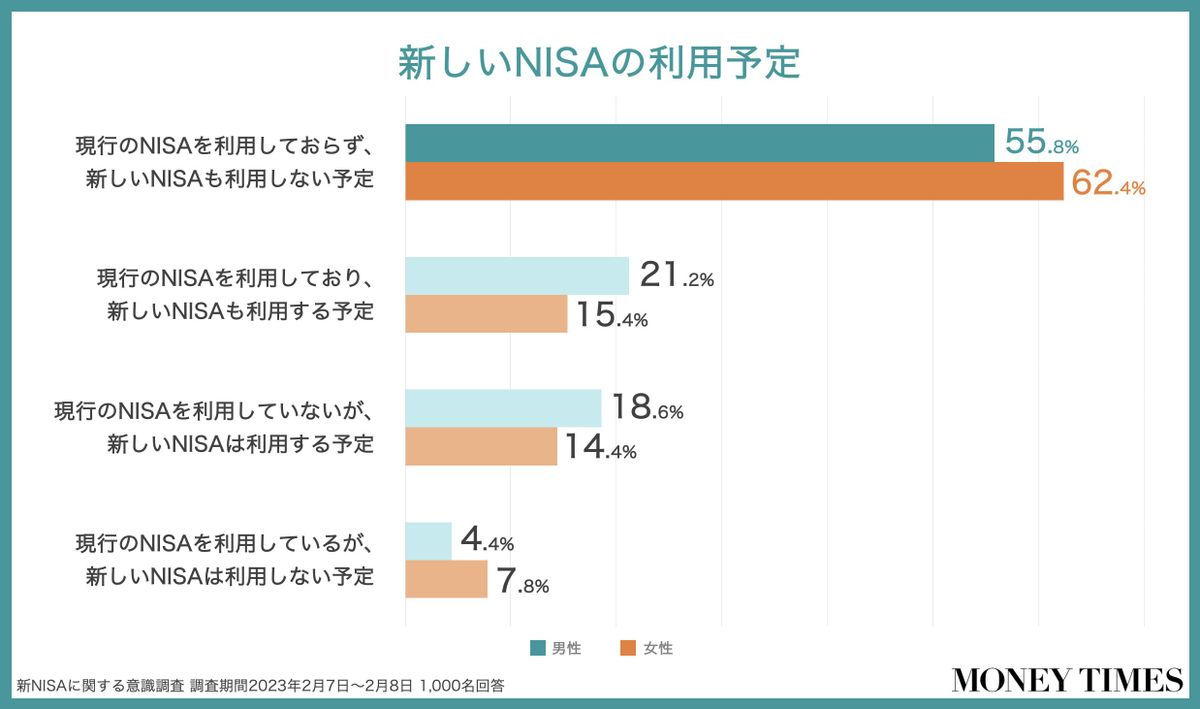 さらに、新しいNISAを利用するか、の質問には「現行のNISAを利用しておらず、新しいNISAも利用しない予定」が、男女とも約60%を占める結果に。一方で、「現行のNISAを利用しており、新しいNISAも利用する予定」は男女とも約20%、「現行のNISAを利用していないが、新しいNISAは利用する予定」は男性が18.6%、女性が14.4%と、いずれも2割以下となった。