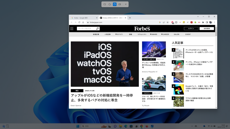 また、キャプチャ直後に「Snipping Tool」の通知が表示され、クリックすればSnipping Toolでキャプチャした画像を編集できる。