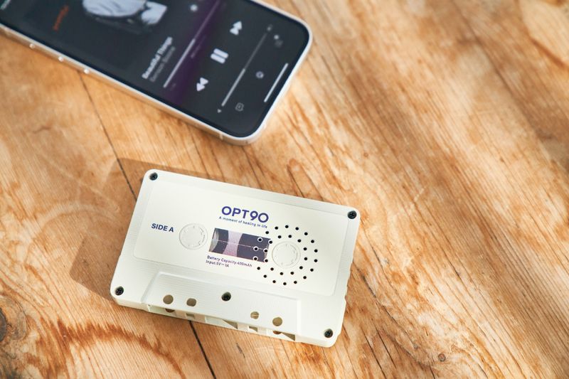 「Opt! OPT90 カセットスピーカー」は、製品名の通り、カセットテープそっくりの見た目を持つBluetoothスピーカー。スマホやパソコンとBluetooth接続して音楽再生できるほか、MicroSDカードにも対応している。