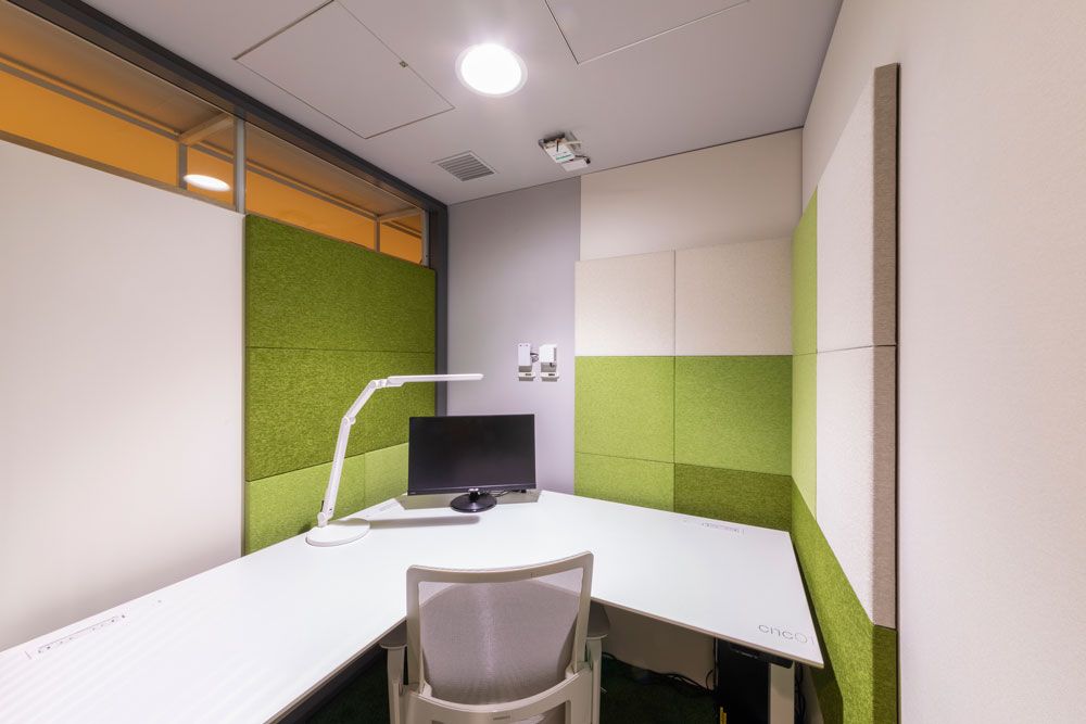 昨今、「完全個室」よりもコストメリットのある「欄間オープン個室」では、音漏れや秘密情報の漏えい問題が顕在化している。そこで大建工業の吸音パネルとTOAの自然音マスキングを融合し、音環境を改善。隣接する個室への会話漏れ防止を実現した。