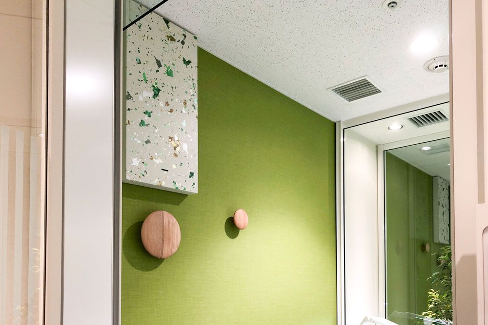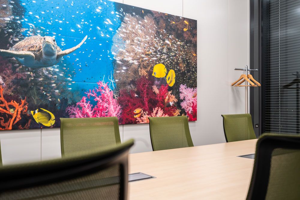 機能性とデザイン性を両立させたインクジェット吸音パネルを共同開発。張地には好みの写真やイラストがプリント可能。導入物件では、パネルを設置した会議室の予約率が向上した。