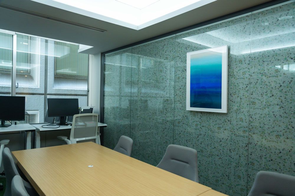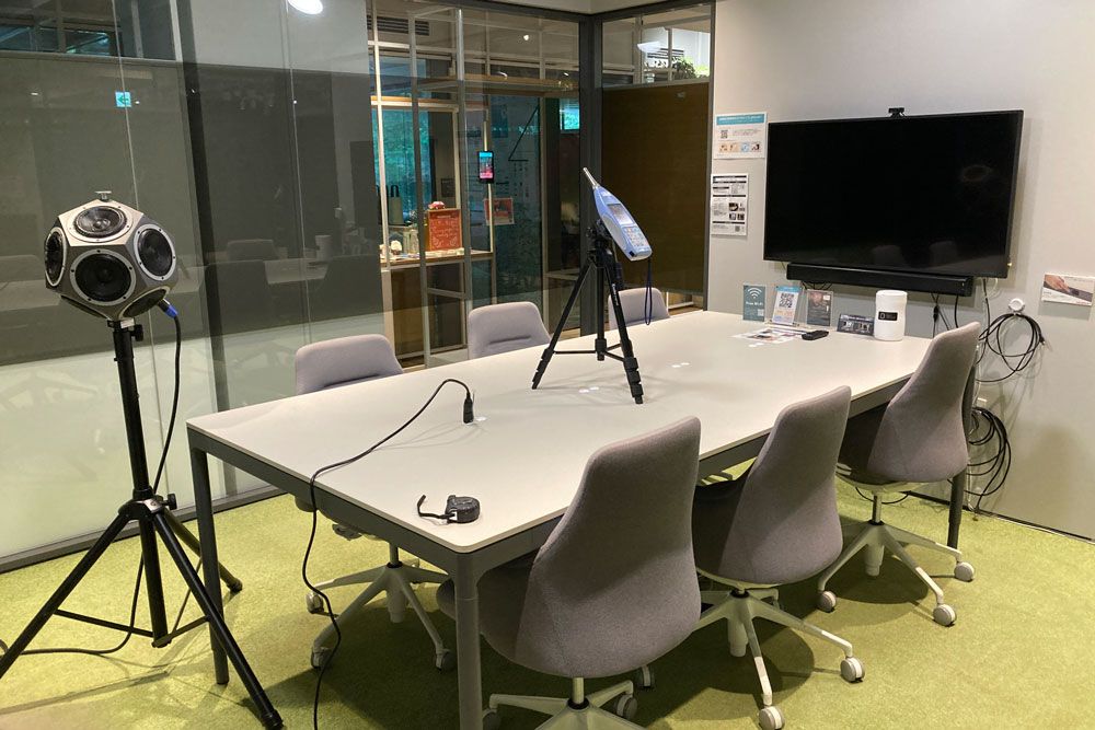 音の響きに課題のあるガラス張りの会議室にて、置き型の音響調整部材「サウンドトロン」を設置した実証実験。結果、WELL認証で定められた残響時間基準をクリアした。