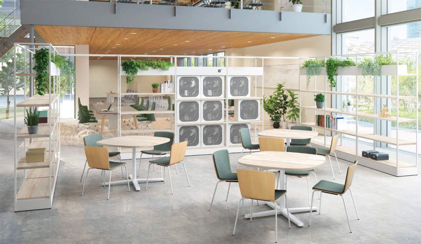 ダイキン工業が開発した、自然の風を再現する大型送風機「Wind Creator」。それをオカムラの家具シリーズ「Lives(ライブス)」のシェルフに組み込み、ユニットとして開発。point 0 marunouchiでの実証実験から、初めて商品化が実現した事例だ。