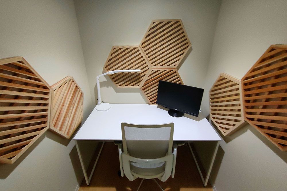 特許技術「交差リブ構造」を用いた国産スギ材の音響デザインパネル。本パネルを設置した個室ブースで、音環境と見た目の印象向上効果をユーザーアンケートにより実証した。実証実験は「ウッドデザイン賞2023」を受賞。