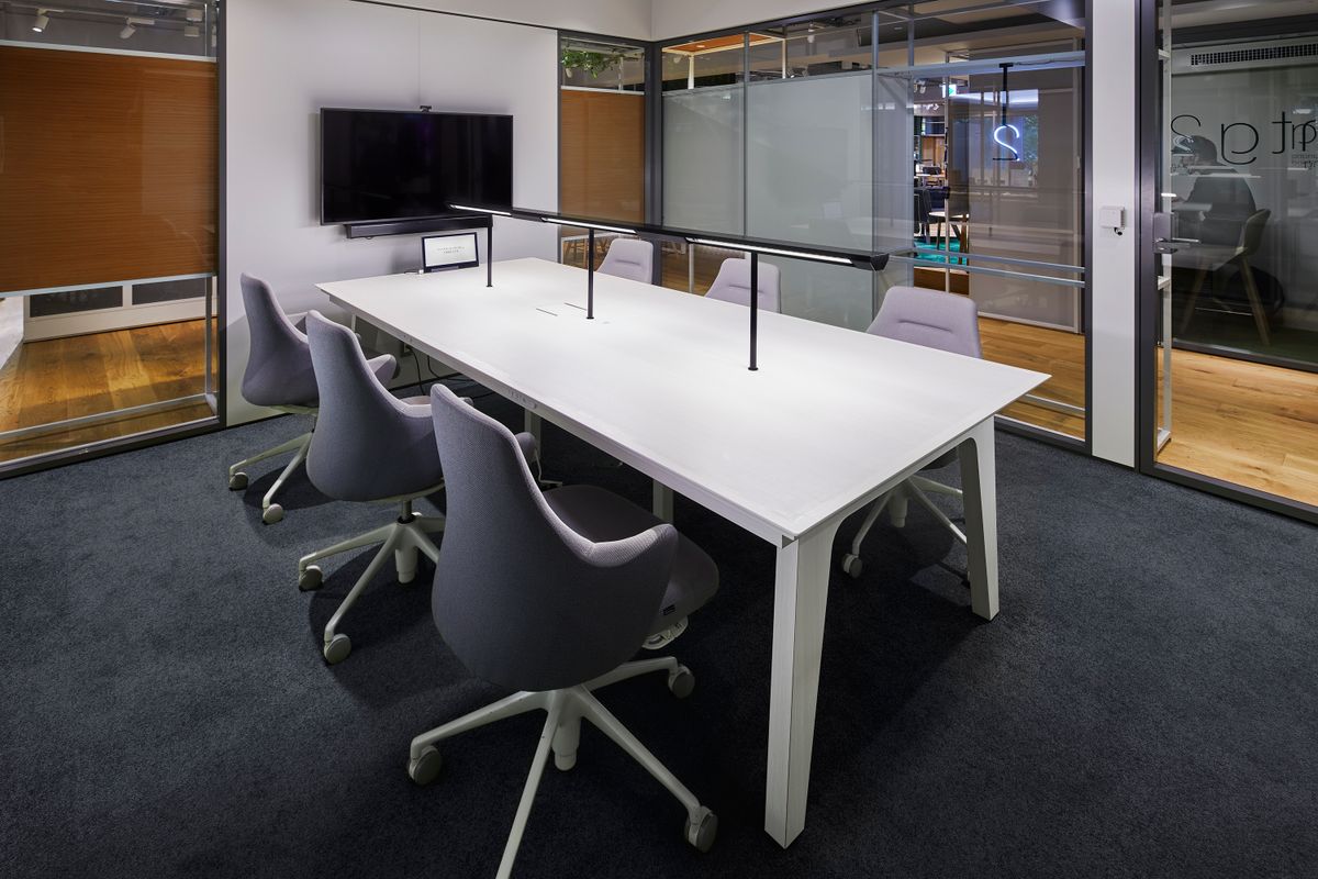 複数人が同一空間から参加するウェブ会議での聞こえにくさを解消すべく、マイクとパネルスピーカーを内蔵した、高品質な音環境をかなえるミーティングテーブル。ボイスオーダー機能も付属。新宿野村ビルのH¹T Lab powered by point0に導入。