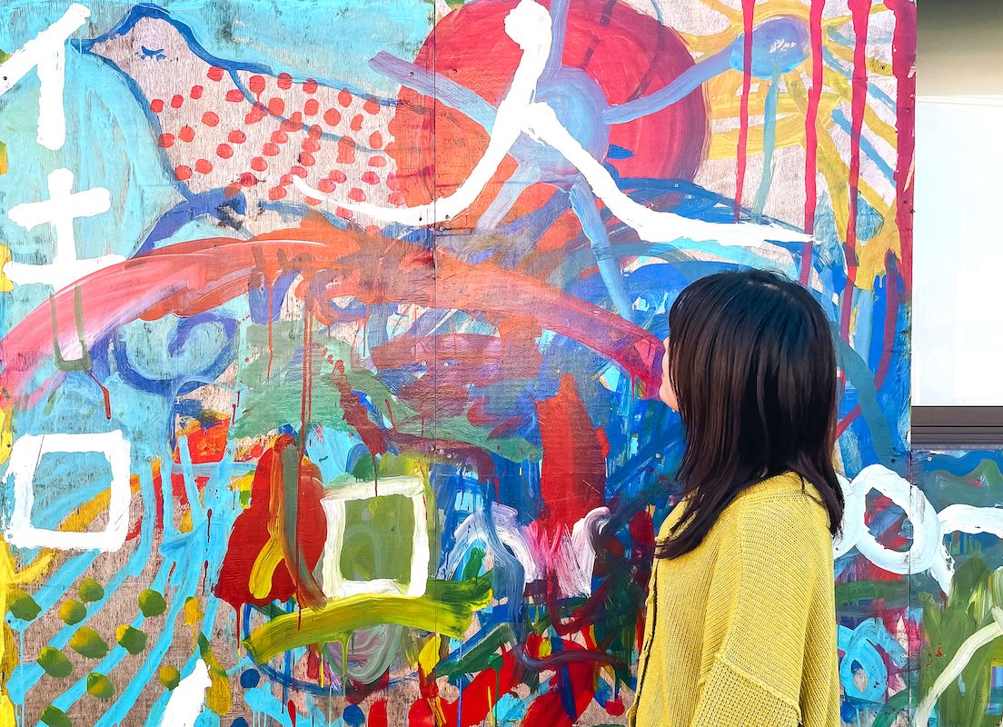 「希望のまち予定地」にある仮施設SUBACO前にて。壁面の絵は、北九州市在住の黒田征太郎氏とともに地元の子供たちが描いたものシェアハウスの運営も