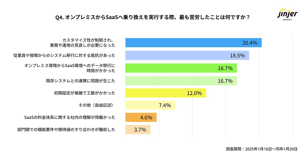 ただし、いいことばかりではない。乗り換えにあたって苦労した点を聞くと、36.5パーセントともっとも多かったのが「カスタマイズ性に制限があり、できないことが多い」というものだ。また、「他の既存システムとの連携・統合が複雑」、「運用にあたり必要機能が不足している」などがあげられた。ただ、こうした技術的な問題は次第に解決されていくはずだ。DXの推進、IT人材不足を考えると、SaaSは有力な選択肢になるだろう。