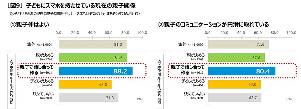 さらに、現在の親子関係については、親子仲がいい、親子のコミュニケーションが円滑にとれていると答えた保護者の割合も、親子でルールを決めている家族のほうが多かった。