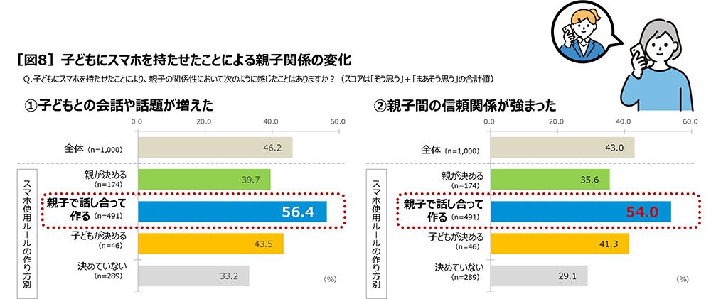 子どもにスマホを持たせたことによる親子関係の変化を尋ねると、会話や話題が増えた、信頼関係が強まったという2つにおいて、親子でルールを決めている家族の割合が突出して多い。