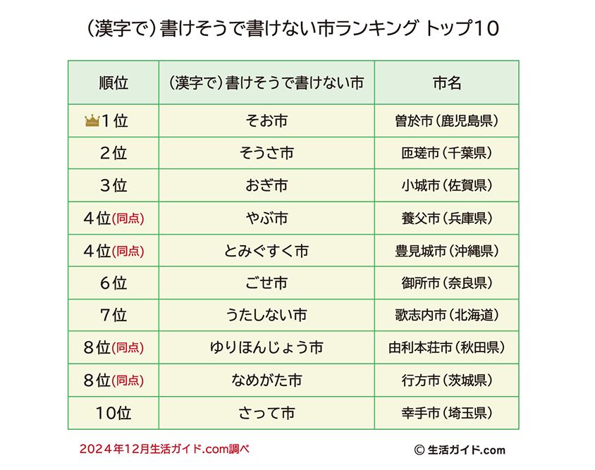 みんなでつくる地域応援サイト「生活ガイド.com」が10代から80代の会員134人を対象に調査を行ったところ、書けそうで書けない市のナンバー1に輝いたのは、鹿児島県の「曽於市」(そおし)だった。2位は千葉県匝瑳市(そうさし)、3位は佐賀県小城市、以下、難しい名前が続く。