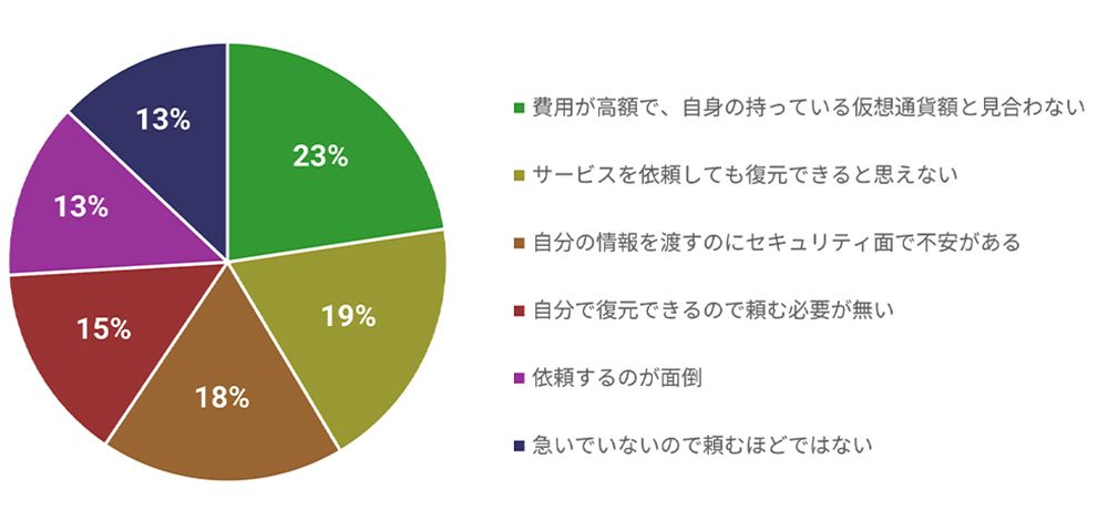 利用経験者、未経験者を含め、利用したくないという人に理由を聞くと、トップは費用だった。着手金などが意外に高く、対象となる資産が何百万円もあれば別だが、少額で割りに合わないどころか「復元する金額を超えてしまうこともある」という。さらに、復元できると思えない、個人情報を渡すのが不安といったサービスへの不信感もある。事実、前述のとおり復元サービス業者自身が難しいと話すトラブルも少なくない。