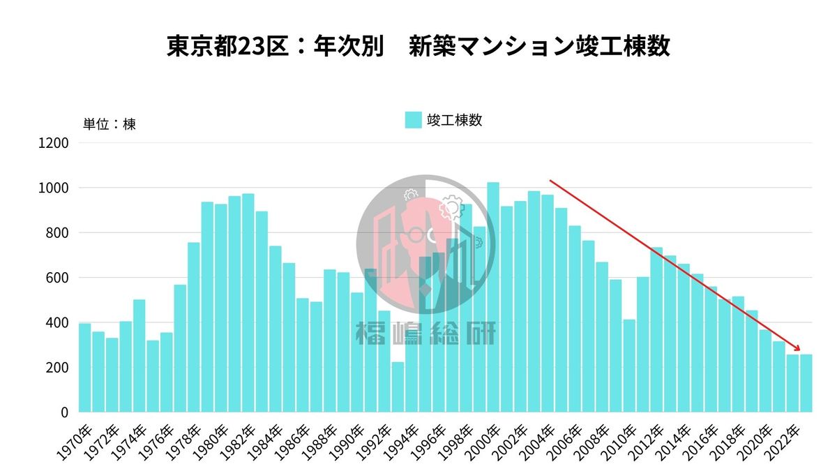 次に「年次別・新築マンション竣工棟数」を見ると、東京都23区の新築マンション竣工棟数は2000年をピークに減少を続けている。新築物件の供給が追いつかないため、築年の浅い富裕層向け中古マンションへの需要が高まり、結果的に高騰を招いているとも考えられる。