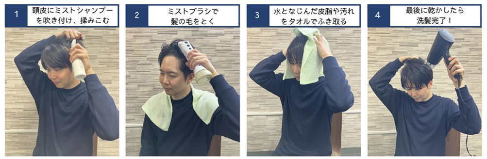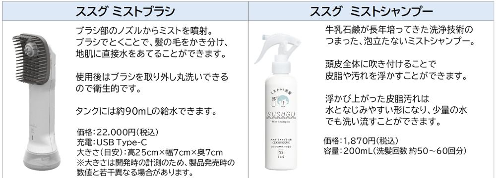 使い方はこうだ。まず泡立たないスプレー式の「ススグ ミストシャンプー」を頭皮全体に吹きつけ指で揉み込む。すると頭皮の皮脂や汚れが浮き上がる。これには「創業115年以上の牛乳石鹸の処方技術」が詰まっているとのことだ。