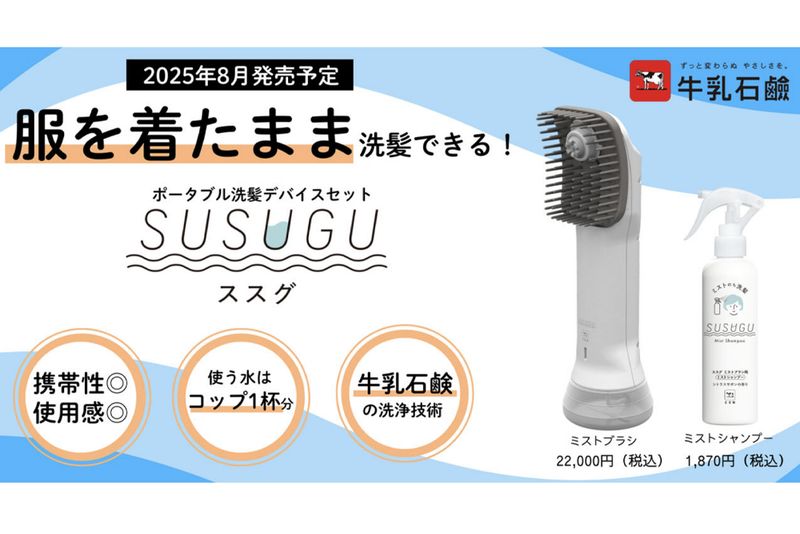 ちなみに「ススグ ミストブラシ」は、牛乳石鹸初の家電製品となる。開発時の名称は「YUAGARI」(ゆあがり)だった。しかし災害の被災経験を持つ人たちから、手や身体はウェットシートなどで対応できても、髪の毛だけはどうしても我慢できないという話を聞き、水で洗うことの重要性を痛感した。水で汚れを洗い落とすという意味の「すすぐ」こそこの製品に相応しいと考え、ネーミングを変更したということだ。