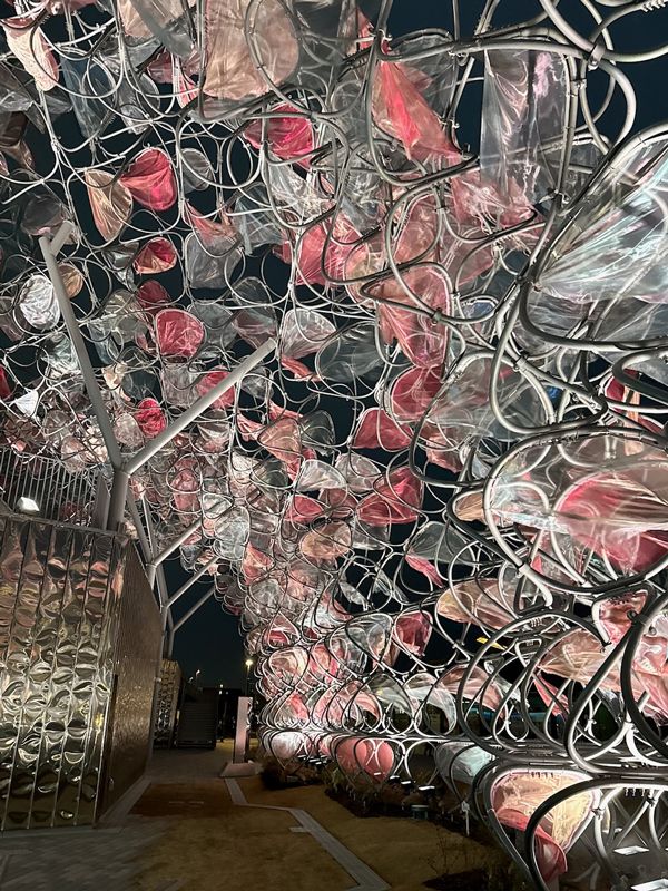 コンペのプレゼン用に描いた最初のスケッチは、実際のパビリオンのデザインに限りなく近い。ただ、イメージに近づけるには技術的な壁をクリアしなければならず、チャレンジングな取り組みとなった。例えば、アーチ状のファサードを構成する一つひとつのバタフライモチーフは循環を表している。スチールパイプを3次元的に曲げたもので、加工には特殊な3Dフォーミング機械を使用。6種類の形状のパイプ1404個を組み合わせて独特のフォルムを作り上げた。
