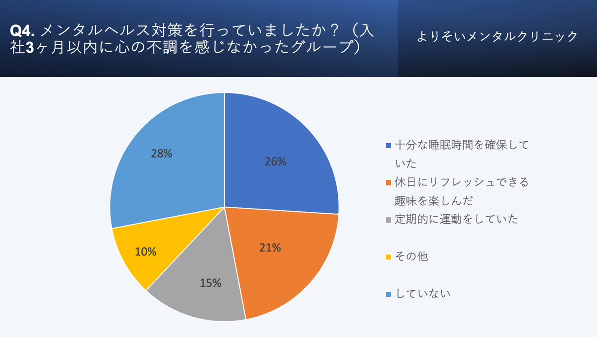 調査で注目したいのは、心の不調を経験しなかった人の約7割が何らかのメンタルヘルス対策を実践していた点だ。「十分な睡眠時間の確保」(26%)、「休日にリフレッシュできる趣味を楽しむ」(21%)、「定期的な運動」(15%)などが効果的な対策として挙げられている。