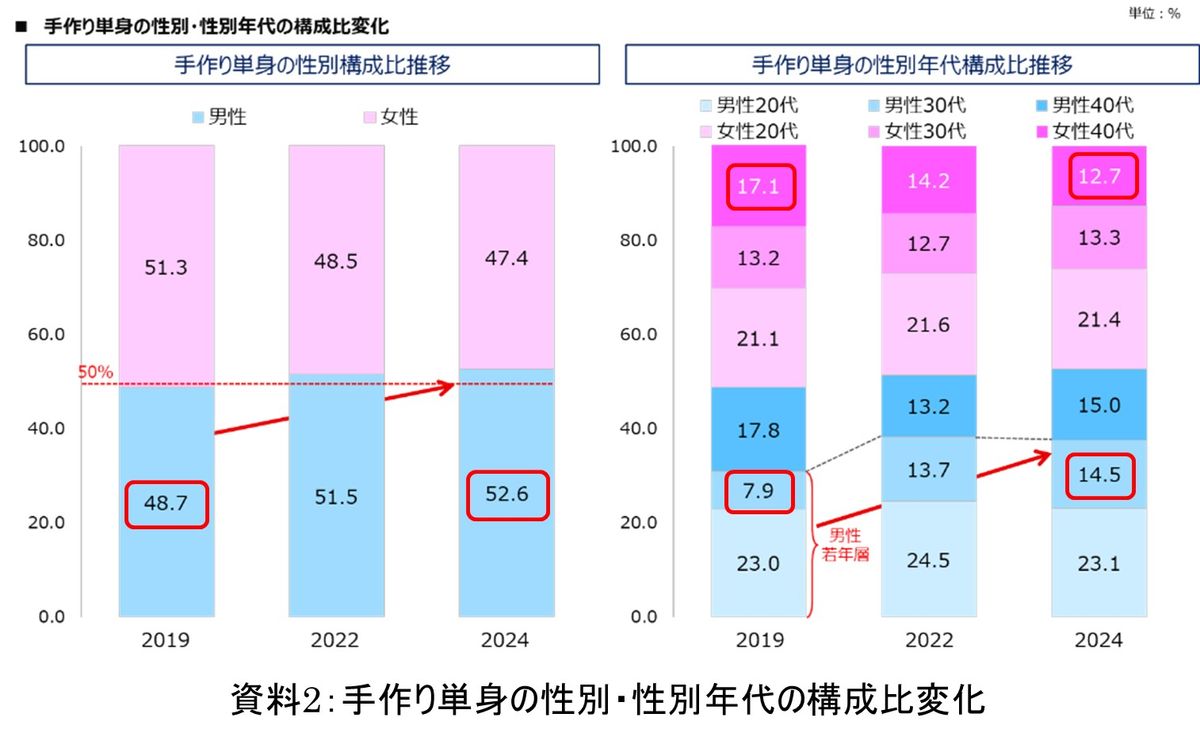食事を手作りする人の割合は、2019年から2024年の5年間で男性の方が3.9ポイント上昇し、女性をわずかに上回っている。年代別に見てみると、男性は30代が増加した一方、女性は40代が減っている。コロナ禍で外食から自炊へ変化した習慣が定着したり、ライフスタイルの変化によって男女比のバランスも変わってきたのかもしれない。