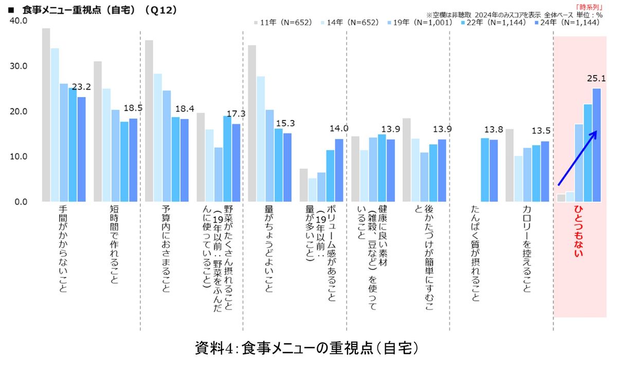 また、食事のメニューで重視する点については、「手間がかからないこと」「短時間で作れること」「予算内に収まること」など、いずれも11年前に比べて減少傾向にあり、一方で増加しているのが「ひとつもない」で、他の項目よりも高い25.1%となっており、食に対するこだわりが薄れている傾向にあるのかもしれない。