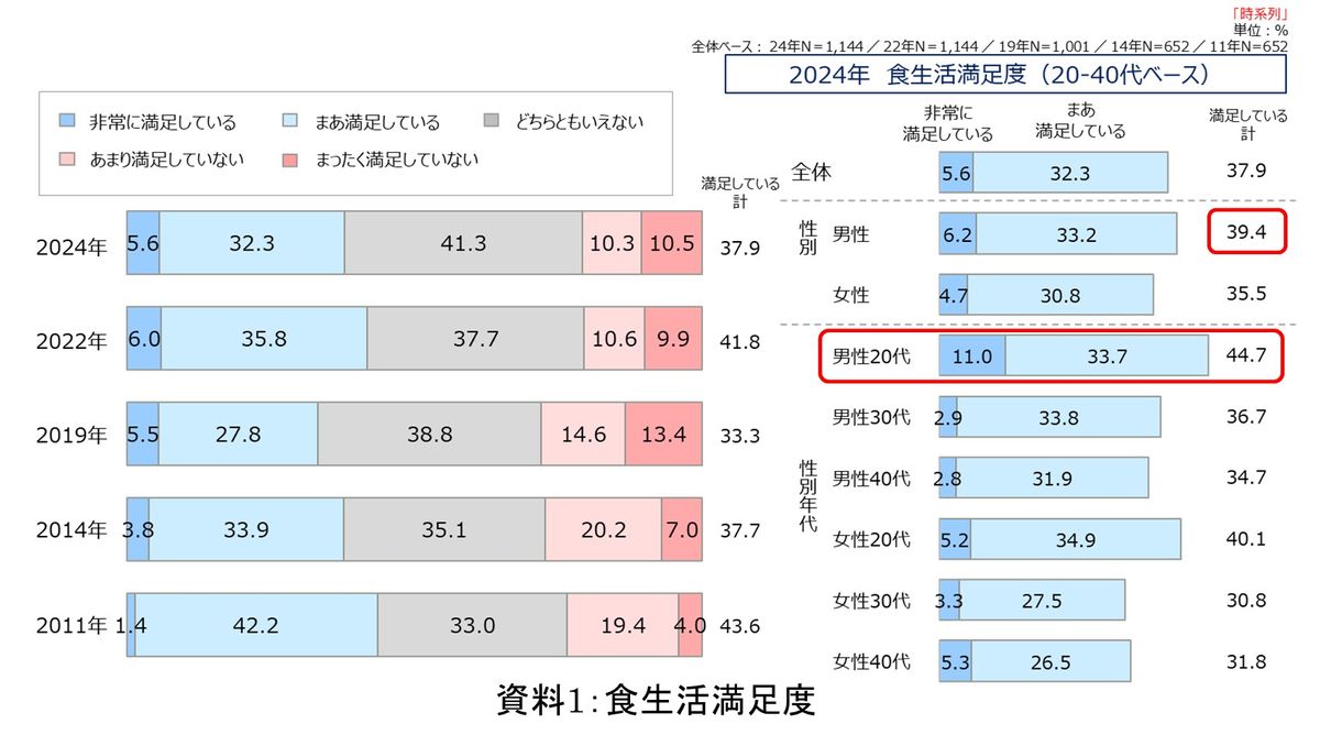 まず食生活の満足度では、20代の男性が44.7%「満足している」と回答。20代女性も40.1%と全体の平均37.9%に比べ高く、若者を中心に食生活に満足している人が他の年代より高い傾向にあった。