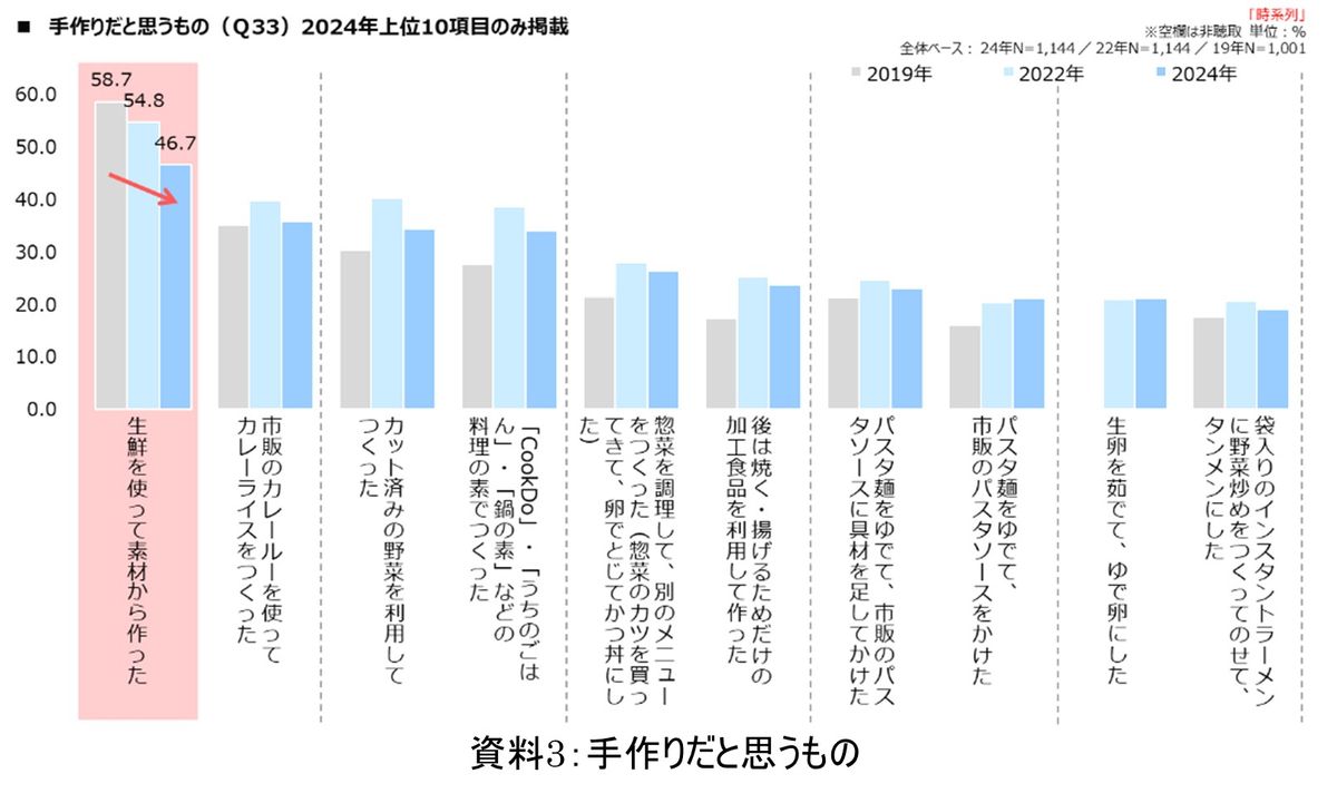 ただ、手作りの概念も変化しており、「生鮮を使って素材から作った」と回答した人は、年々下がっており、「後は焼く・揚げるためだけの加工食品を利用して作った」「パスタ麺を茹でて市販のパスタソースをかけた」「生卵を茹でてゆで卵にした」なども「手作り」に該当すると回答する人が増加している。