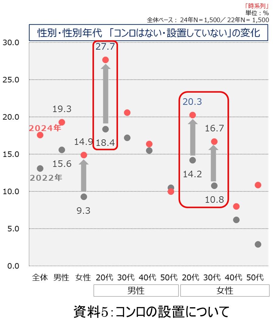 最後に、自宅にコンロ(IH含む)があるかの問いに、ほとんどの世代で「コンロがない」との回答が増えている。特に20代男性は3割近くに達し、女性は40代以外6ポイント以上の増加を示している。最近は電子レンジさえあればなんとかなる時代なので、脱コンロは今後も進む可能性はある。
