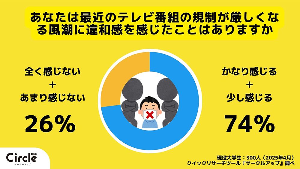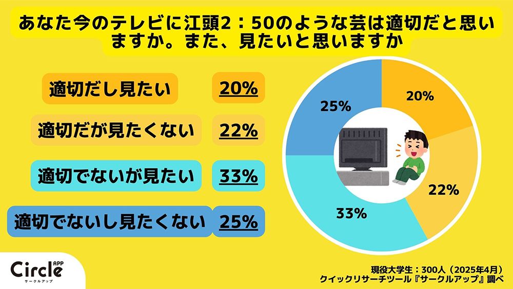 Z世代に特化したクイックリサーチサービス「サークルアップ」が、大学生300人を対象に「テレビ番組の表現規制」に関するアンケート調査を実施したところ、江頭2:50の件に関して、不快に感じた人は36パーセント、感じなかった人は64パーセントだった。